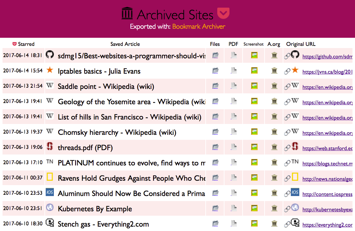 `archive.py` is a script that takes a [Pocket-format](https://getpocket.com/export), [Pinboard-format](https://pinboard.in/export/), or [Netscape-format](https://msdn.microsoft.com/en-us/library/aa753582(v=vs.85).aspx) bookmark export file, and turns it into a browsable archive that you can store locally or host online.